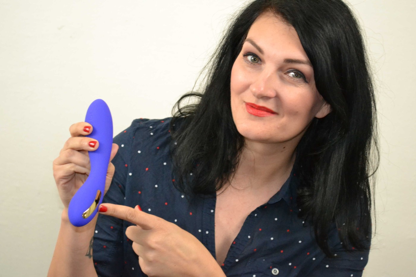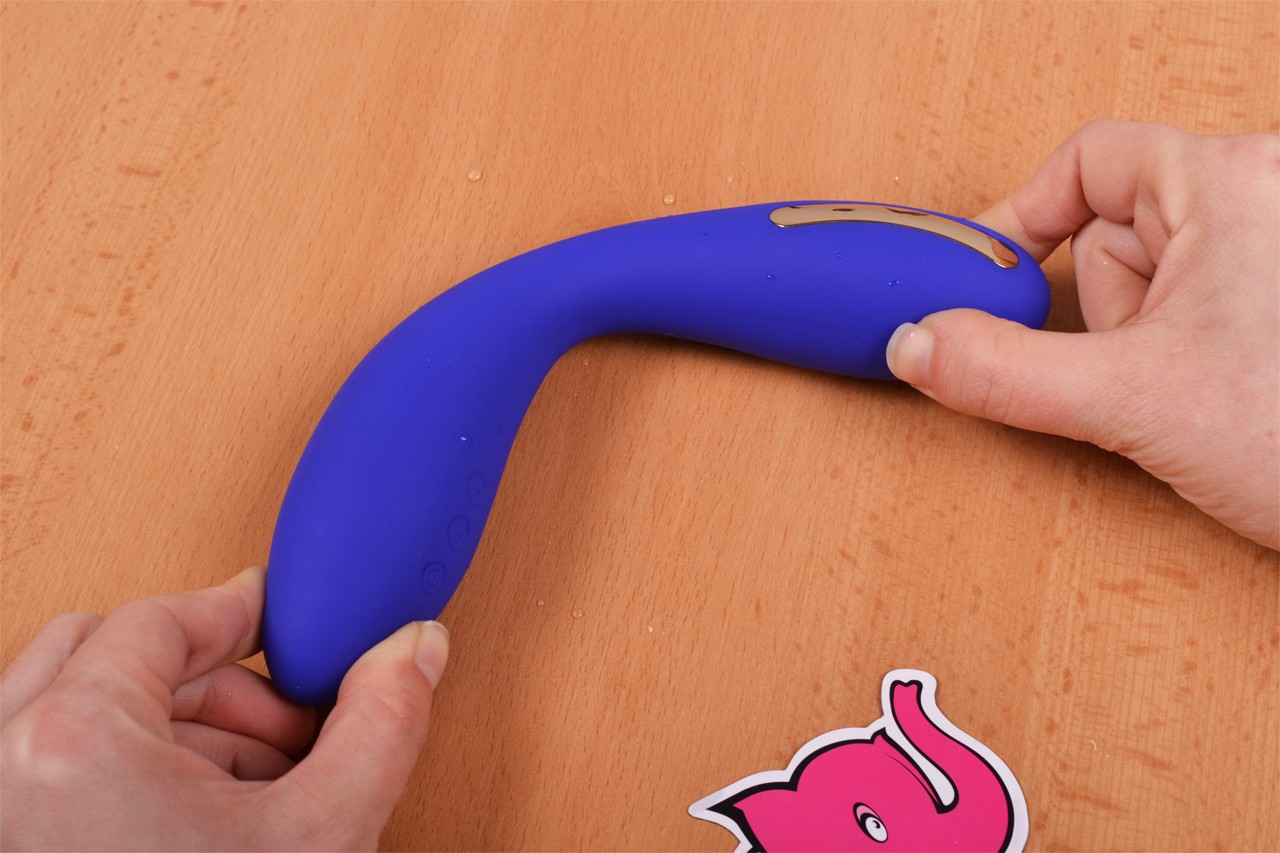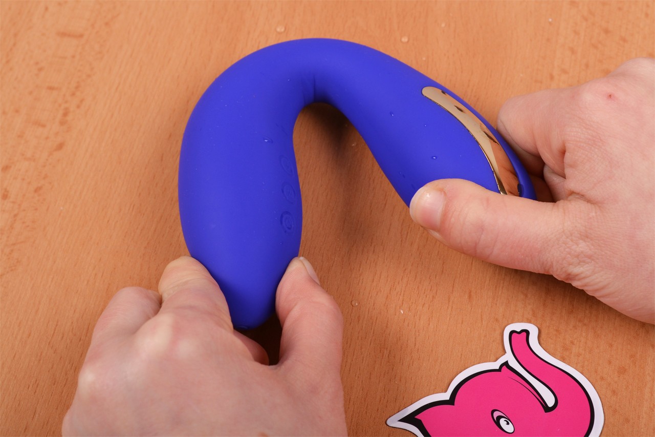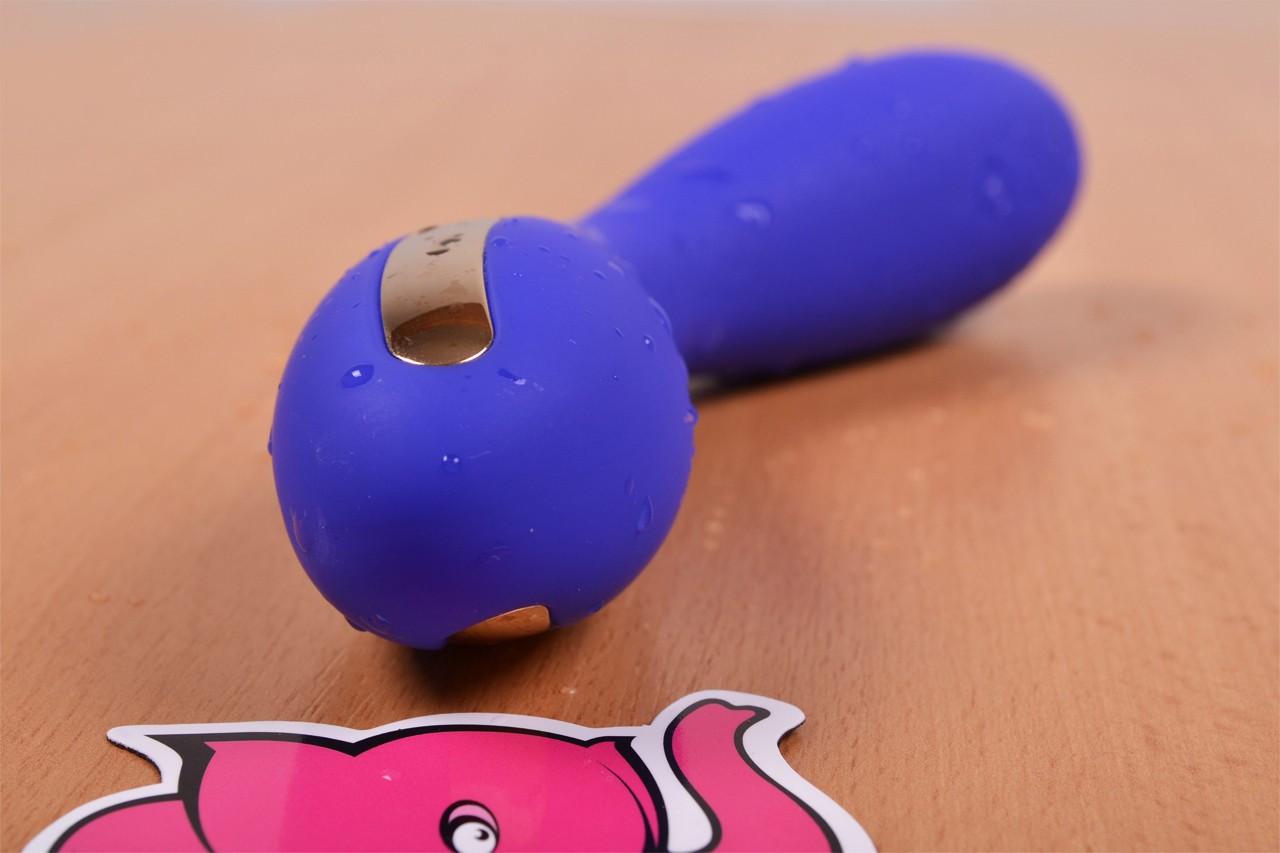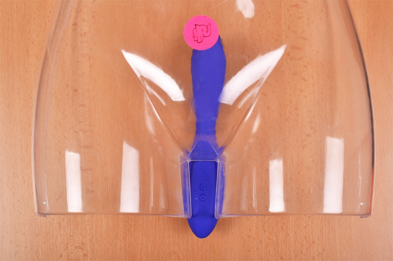 U dizajnerskoj kutiji pronaći ćete prekrasan plavo-ljubičasti vibrator. Njegov oblik je širi kod kontrola, tako da savršeno pristaje u dlan, zatim se sužava poput pješčanog sata i ponovno širi. Vrh vibratora je ukrašen s dvije površine za elektrostimulaciju. Zahvaljujući svom obliku i boji djeluje elegantno i nježno.