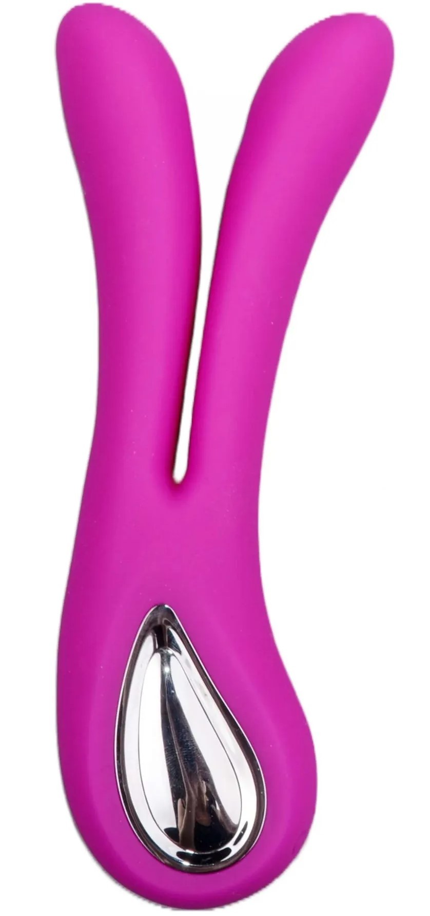 Vibrator u obliku vilice podsjeća na glavu zeca s dugim ušima. Njegov moderan, minimalistički dizajn kombinira jaku ljubičastu boju sa srebrnom postavom. Zahvaljujući široj bazi, igračka dobro leži u ruci, a fleksibilne izbočine obujmljuju penis i razigrano se prilagođavaju ženskoj anatomiji. Uređajem stoga možete istovremeno stimulirati vaginu i klitoris ili anus.